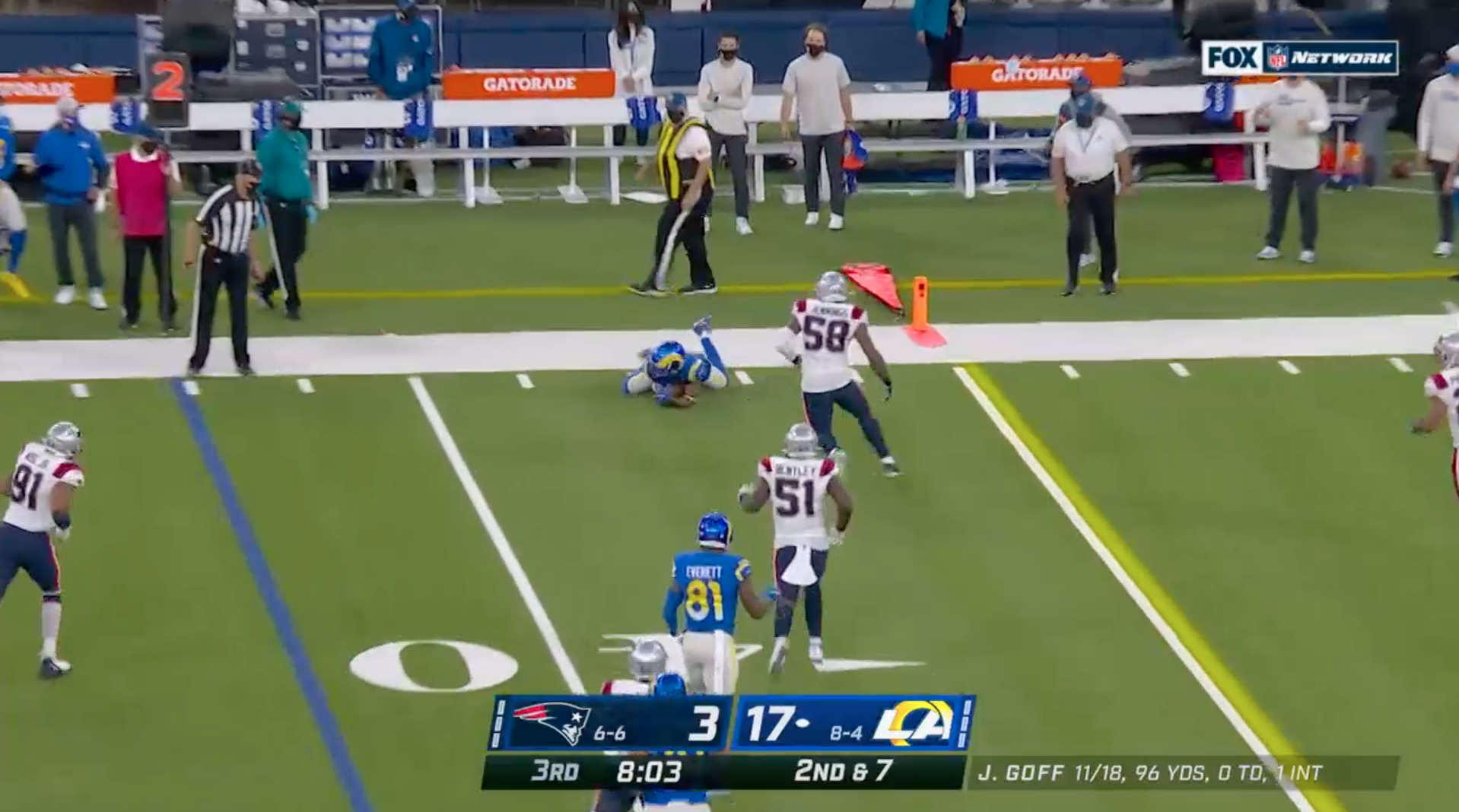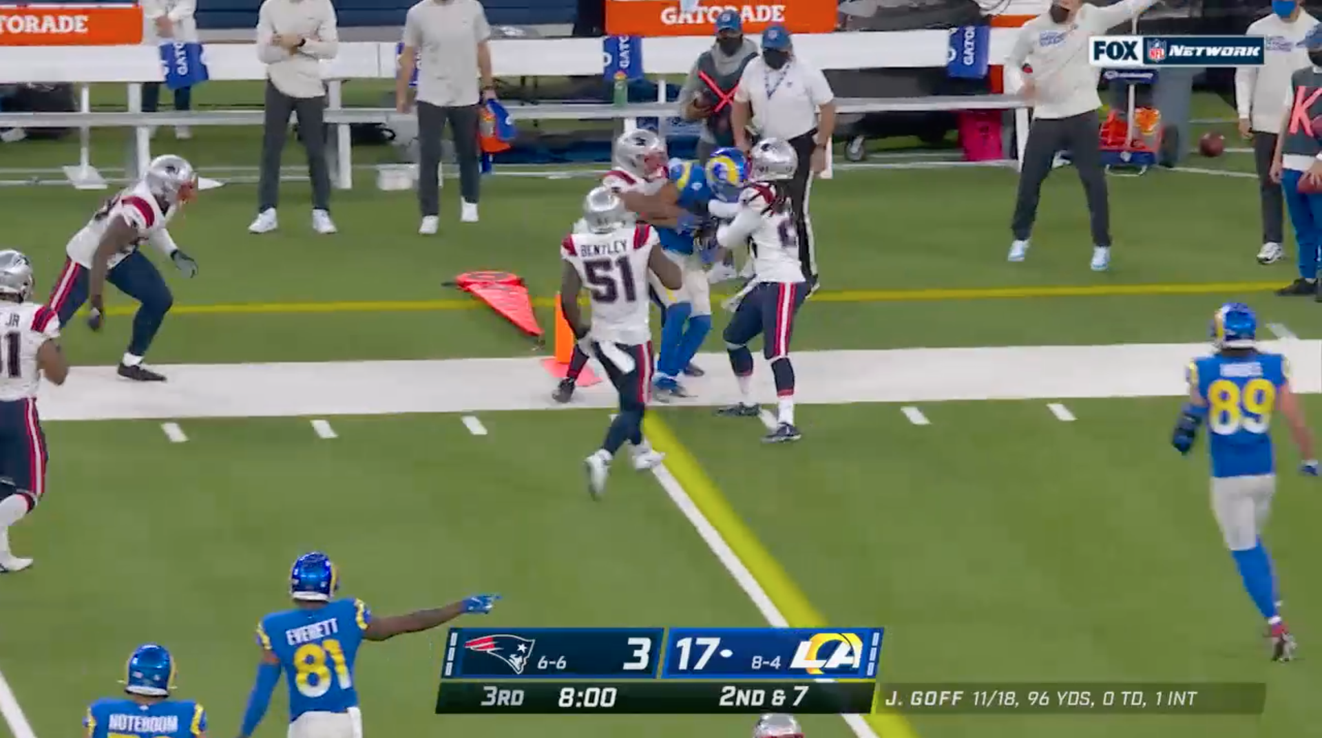 The first came on second-and-7 early through the drive. Robert Woods had to slide to catch a low pass from quarterback Jared Goff. Rookie linebacker Anfernee Jennings went to touch Woods down -- which would have set up a third-and-3 -- but whiffed, allowing the receiver to leap to his feet and pick up first-down yardage.