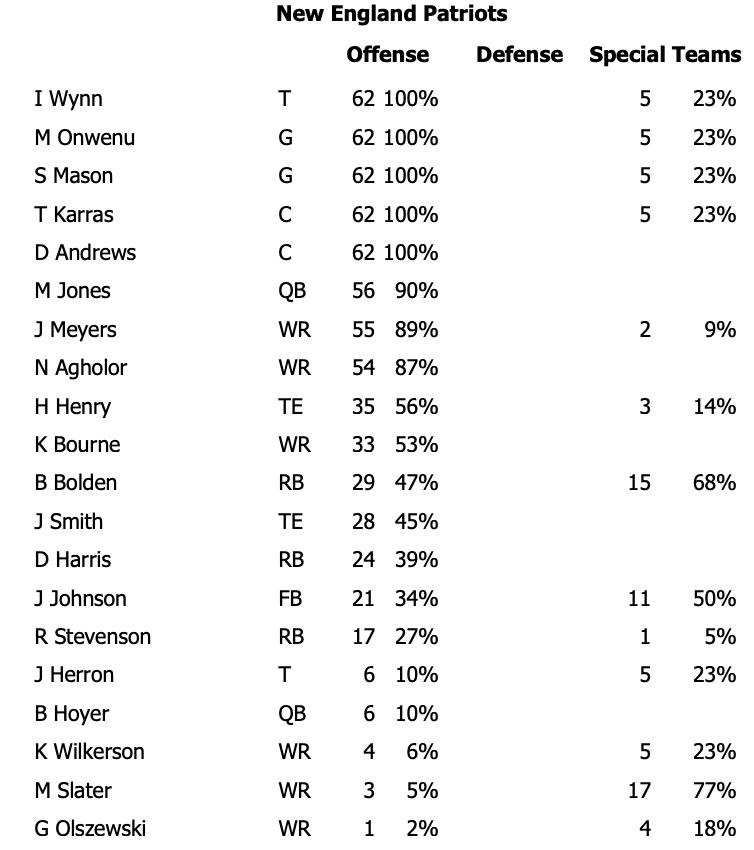 All three backs were heavily involved, with Harris, Stevenson and Bolden all logging 10-plus touches and accounting for 220 of the Patriots' 273 yards. Bolden led the trio with 29 offensive snaps, partially because Harris and Stevenson both left with injuries during the fourth quarter.