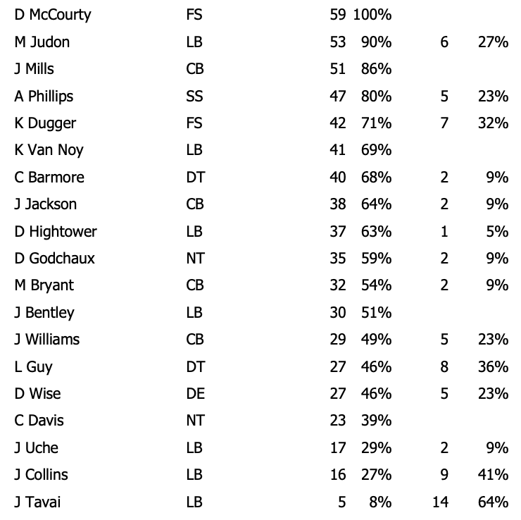 -- Safety Devin McCourty has played every defensive snap in seven of New England's nine games this season.
