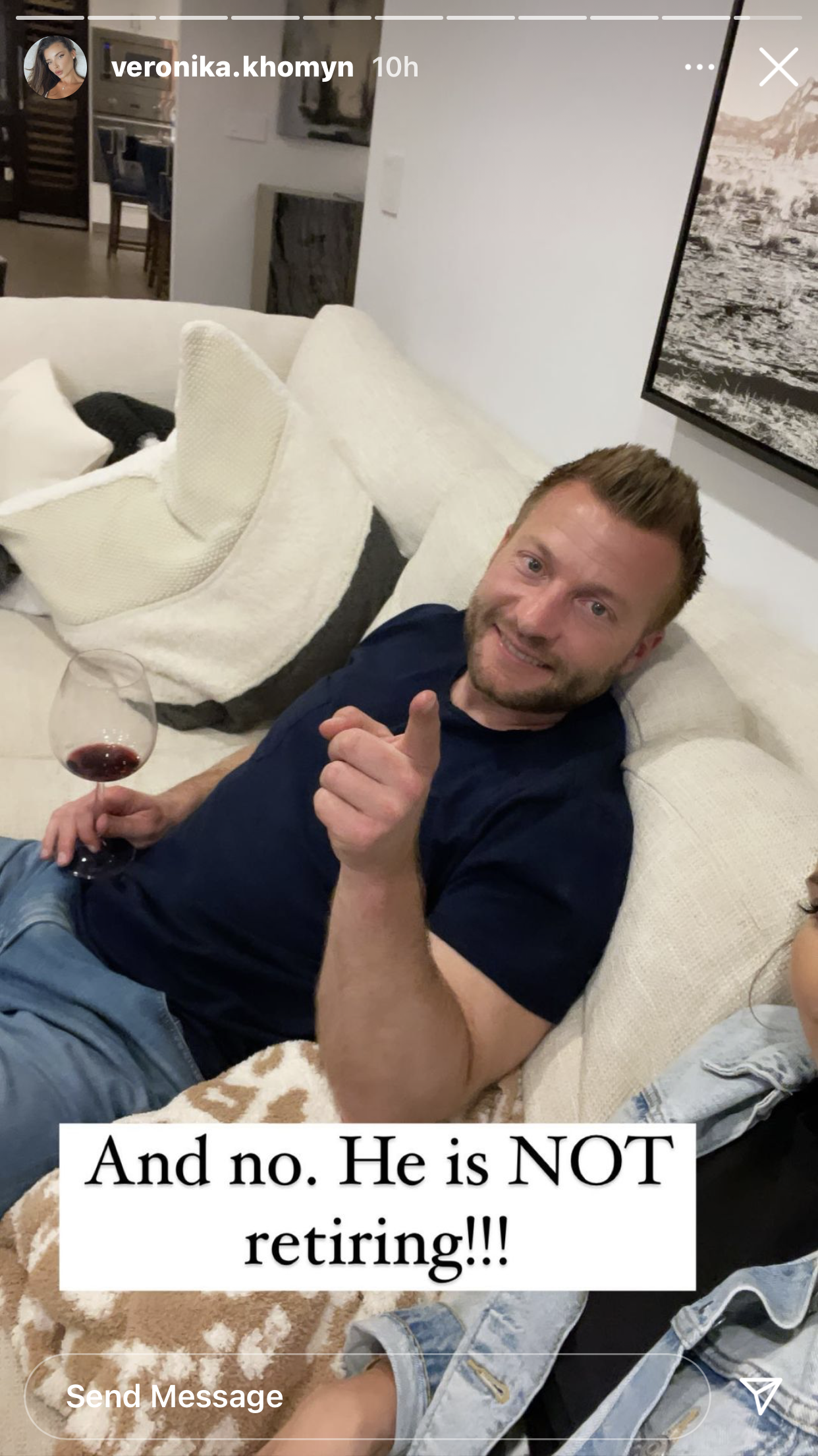 The 36-year-old had rumors surrounding him about retirement or taking a job in TV, but McVay's fiancée, Veronika Khomyn, posted a message to her Instagram story that should clear up any questions about what he'll be doing next season.